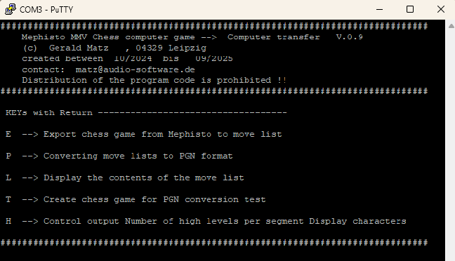 Nachdem wie im Videozu sehen ist, die Partie vom Mephisto Modular exportiert und in das PGN Format gewandelt wurde, markieren Sie die PGN Schachzüge im seriellen Monitor von Putty,